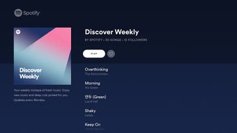 سمات: صوت عالي الجودة بدون إعلانات احصل على الموسيقى الخاصة بك على الشاشة الكبيرة مجانًا استمتع بالبودكاست أيضًا. تصفح الفنانين والألبومات والأغاني وقوائم التشغيل مشاهدة صورة الغلاف تحكم سهل على الشاشة من جهاز التحكم عن بعد الخاص بالتلفزيون أو باستخدام Spotify Connect على هاتفك أو جهازك اللوحي (Premium فقط)